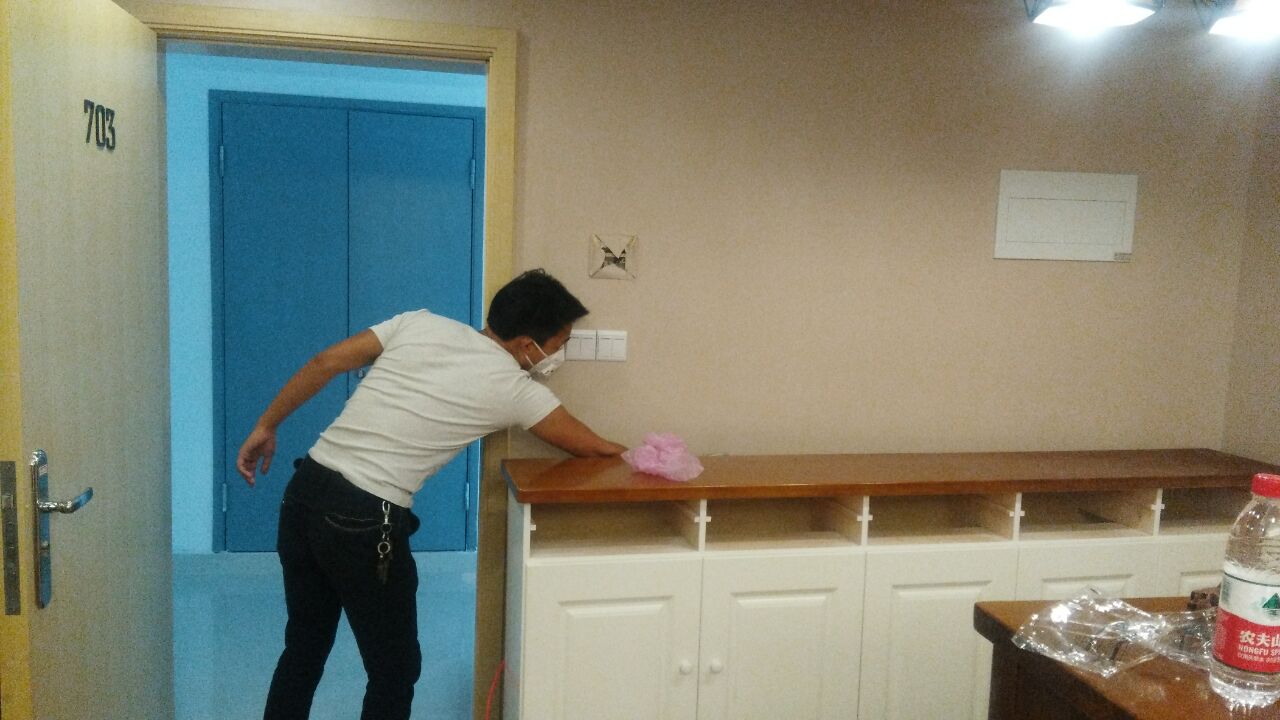 治理方案及施工:公司針對其房屋結(jié)構(gòu)特點及污染情況,我公司技術(shù)及施工人員采用專項治的施工方案,針對其墻體立面(墻紙)、沙發(fā)、等污染源表面使用我公司自主研發(fā)的利純納米光觸媒進行甲醛清除,采用高壓霧化噴涂的方法,最大限度消除室內(nèi)的甲醛污染,對于重新刷漆的家具、門、書架、衣柜等采用甲醛清除劑進行處理,對于床底部位則使用生物酶異味清除劑,針對不同污染物,做全面治理,治理后的室內(nèi)環(huán)境達到國家規(guī)定的室內(nèi)空氣質(zhì)量指標范圍內(nèi),業(yè)主對我公司的治理給予充分肯定。下面為施工現(xiàn)場照片:
